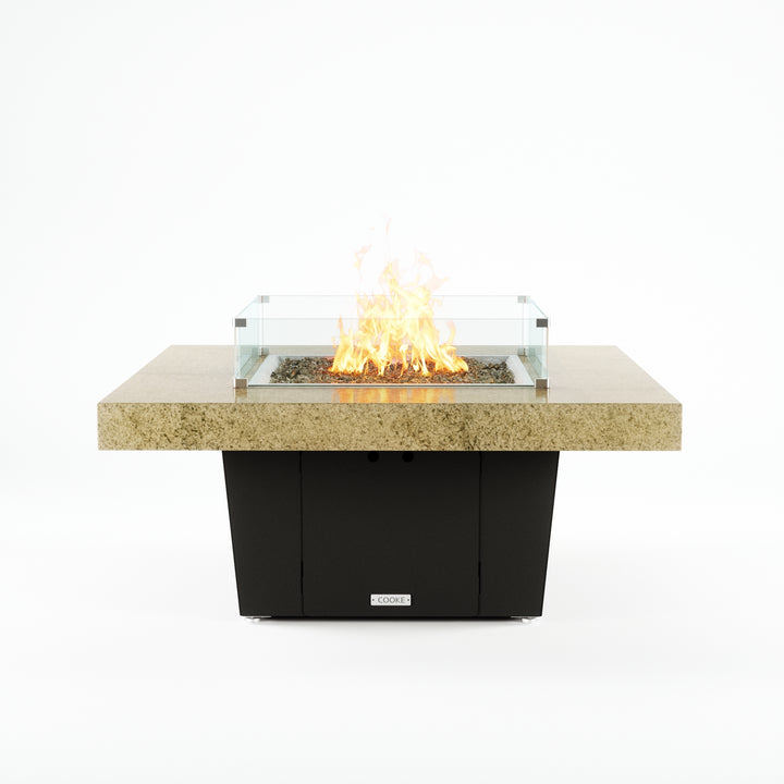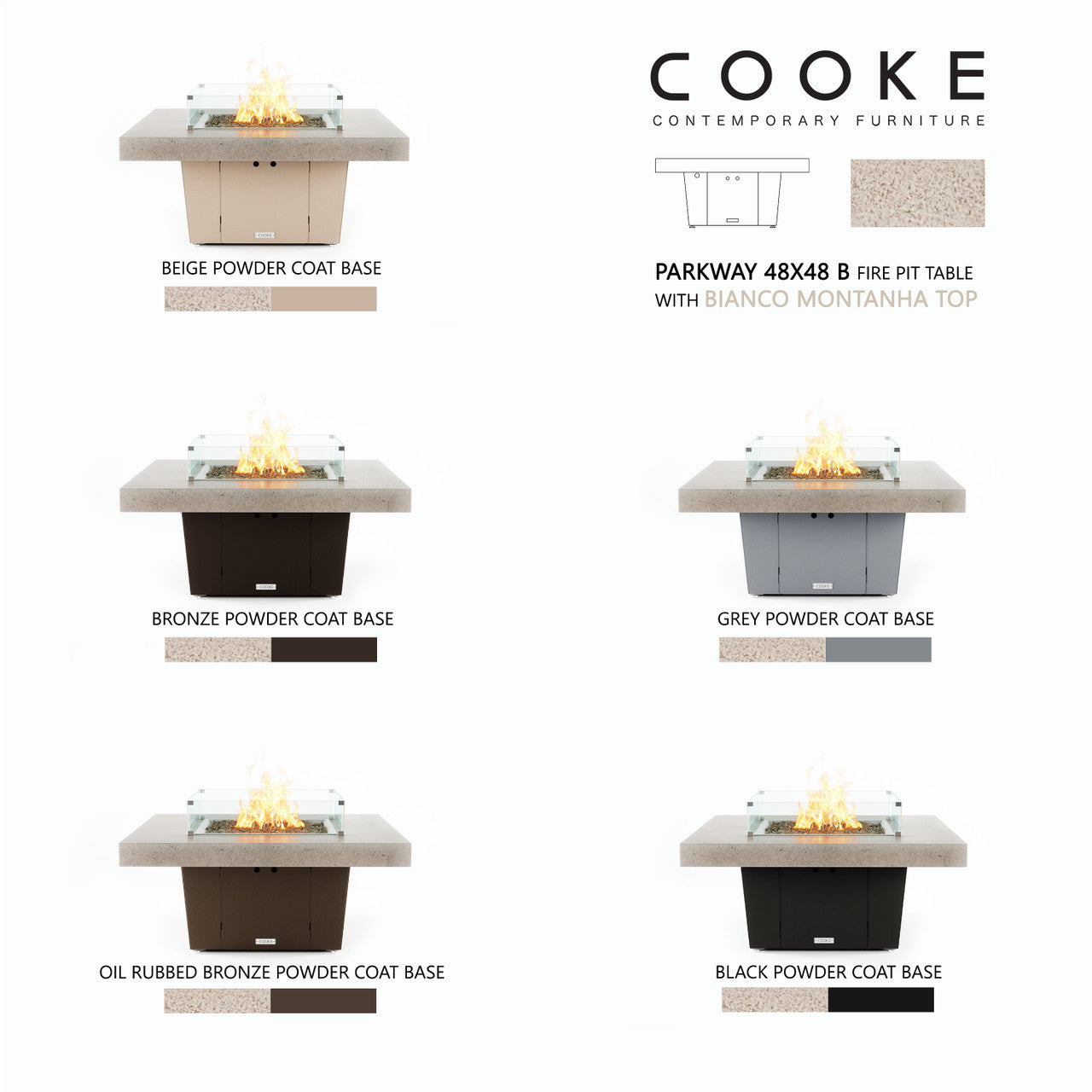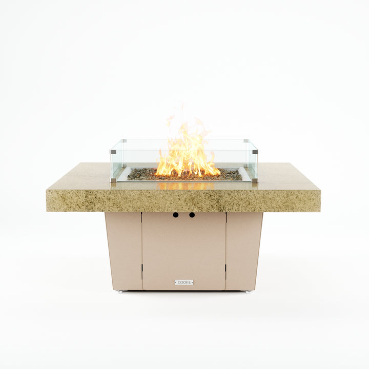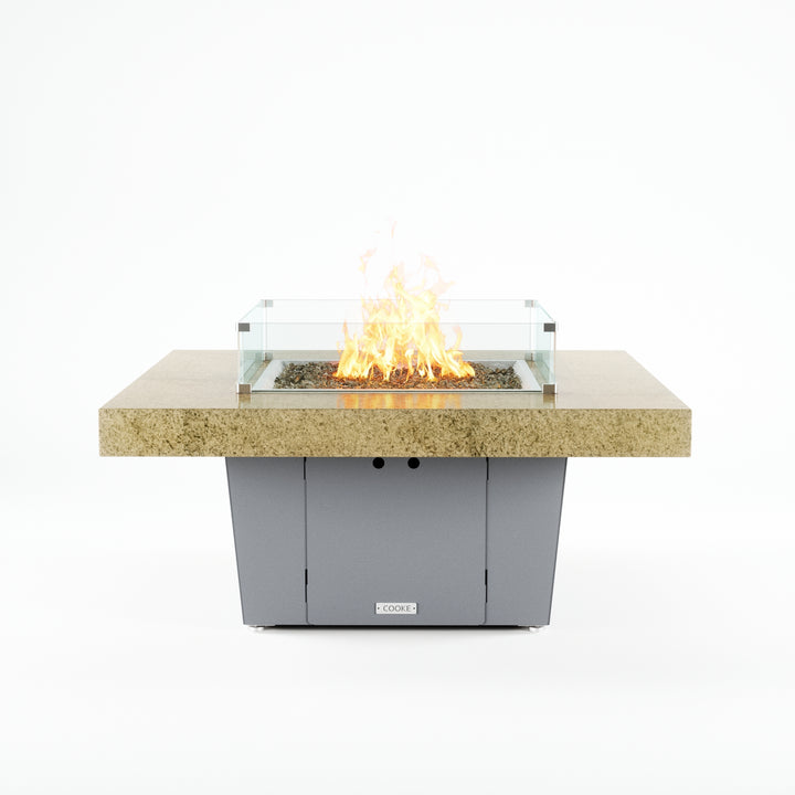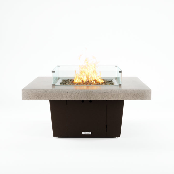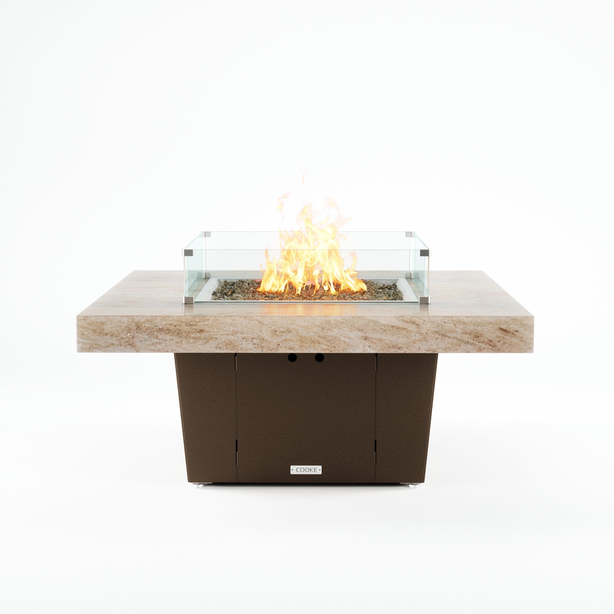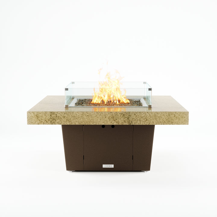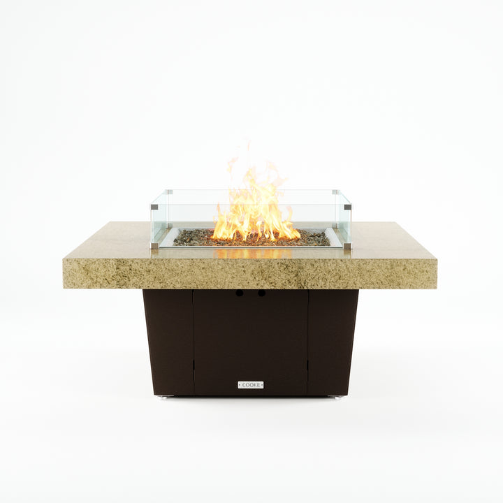 Designed and made in California, this COOKE Parkway features an oversized 48" x 48" top that is going to look great on the patio or next to the pool. This table features everything you want in a square fire pit table. Choose from the bronze, oil rubbed bronze, black, beige or grey base and decorative fire pit media to customize the table like you want. This square fire pit table package includes a tempered glass windscreen.