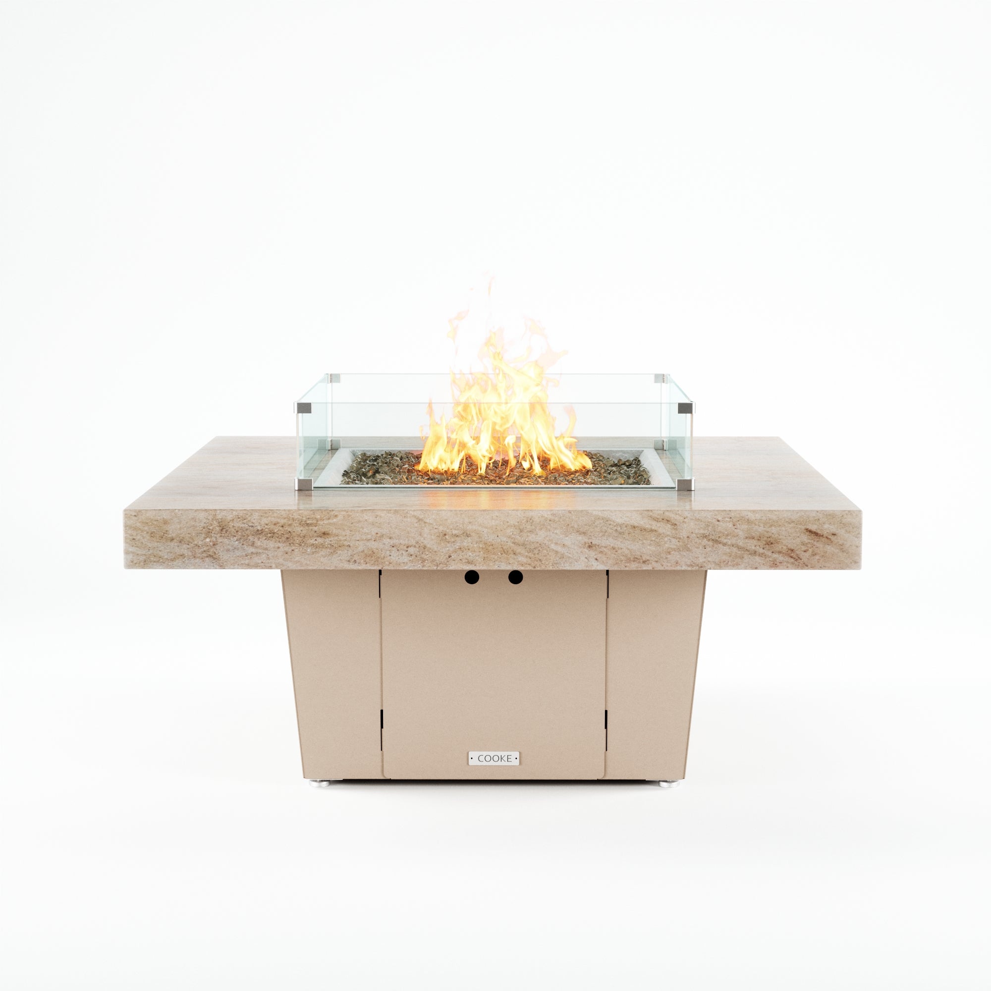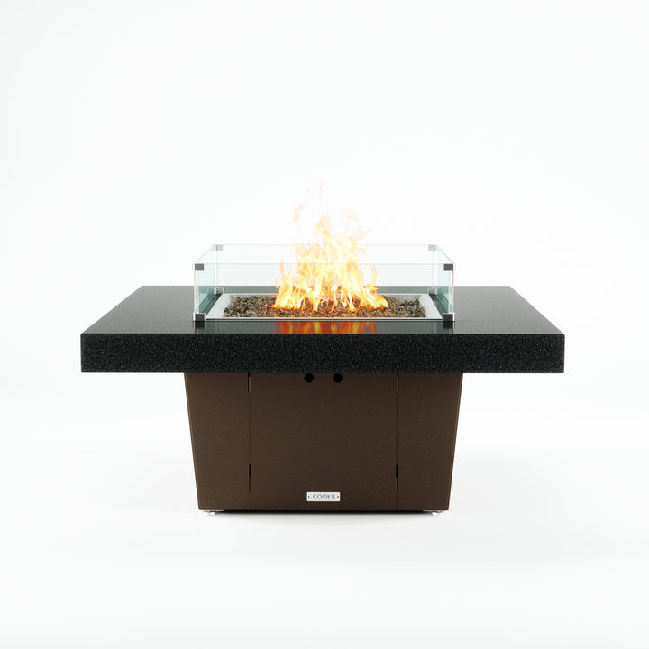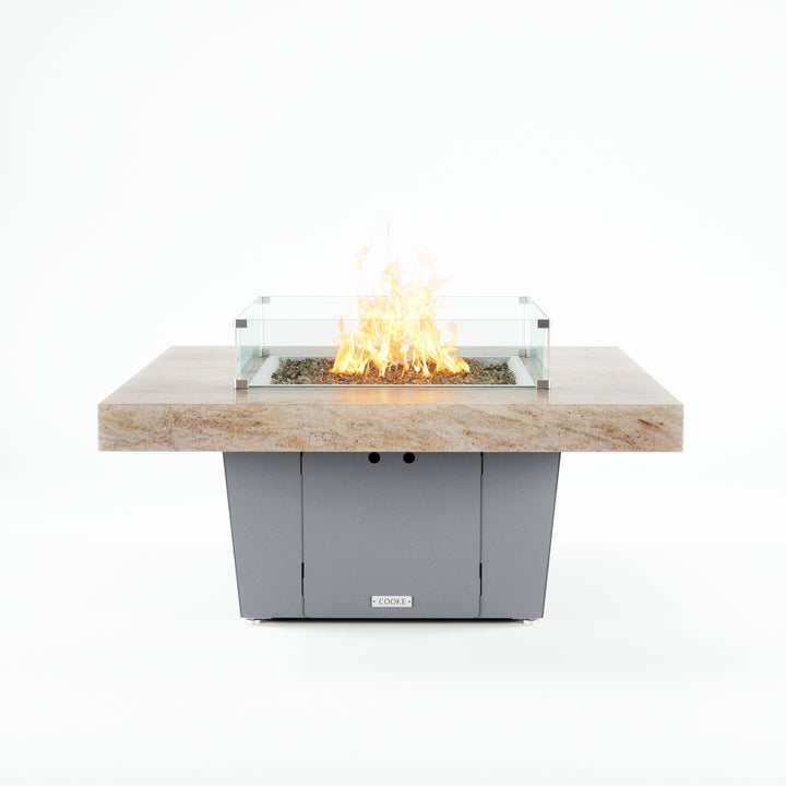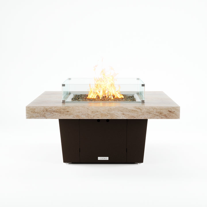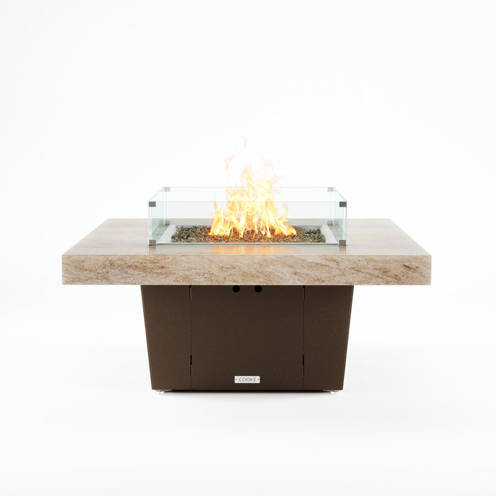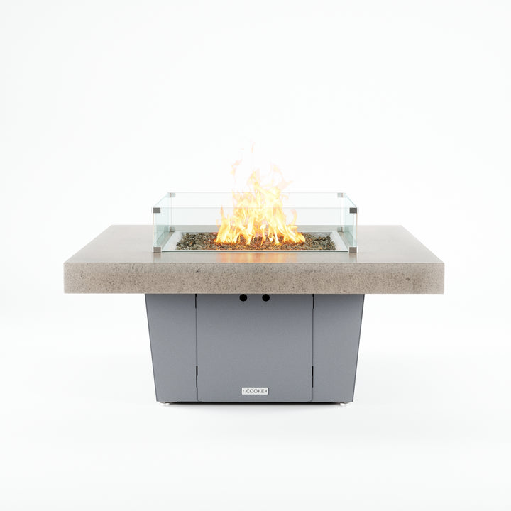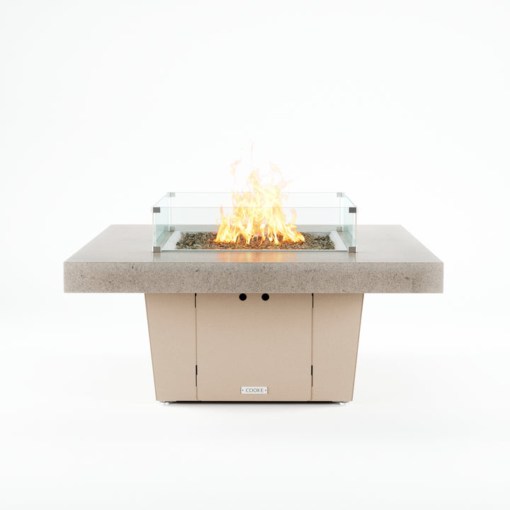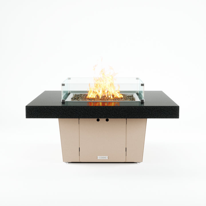 Designed and made in California, this COOKE Parkway features an oversized 48" x 48" top that is going to look great on the patio or next to the pool. This table features everything you want in a square fire pit table. Choose from the bronze, oil rubbed bronze, black, beige or grey base and decorative fire pit media to customize the table like you want. This square fire pit table package includes a tempered glass windscreen.