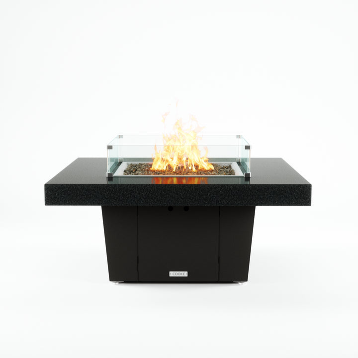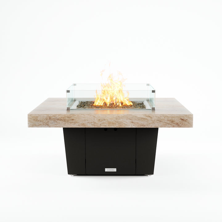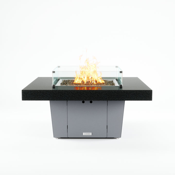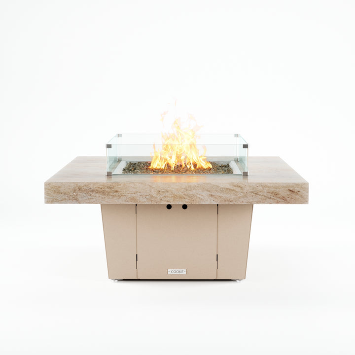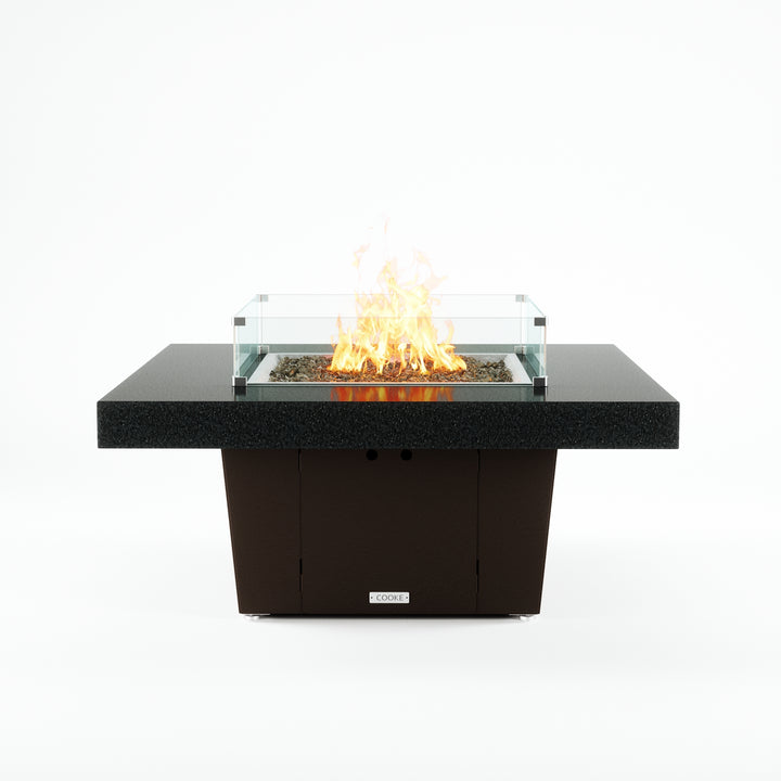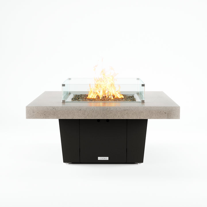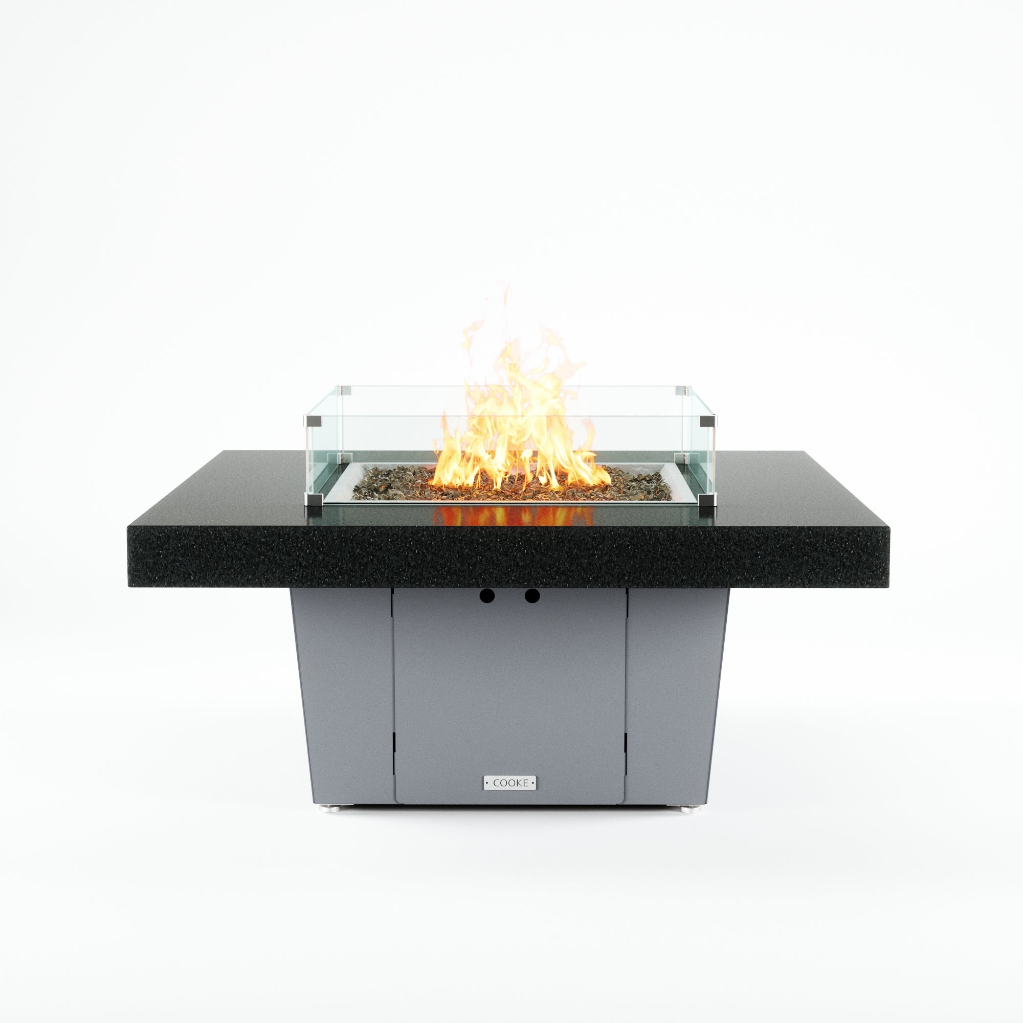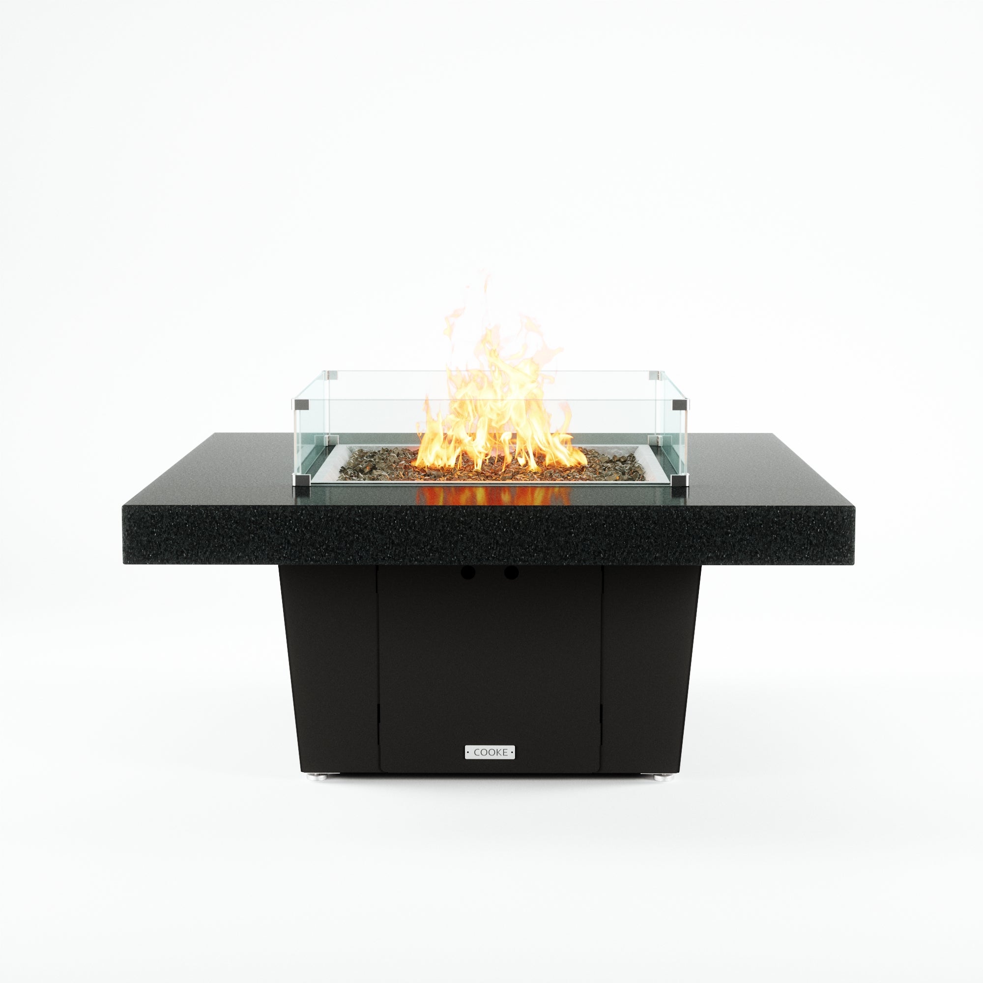 Designed and made in California, this COOKE Parkway features an oversized 48" x 48" top that is going to look great on the patio or next to the pool. This table features everything you want in a square fire pit table. Choose from the bronze, oil rubbed bronze, black, beige or grey base and decorative fire pit media to customize the table like you want. This square fire pit table package includes a tempered glass windscreen.