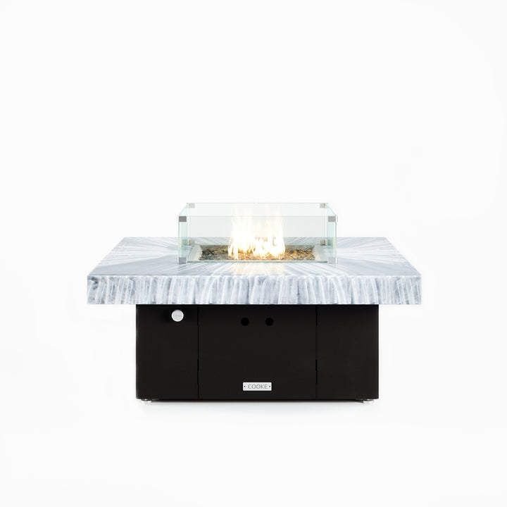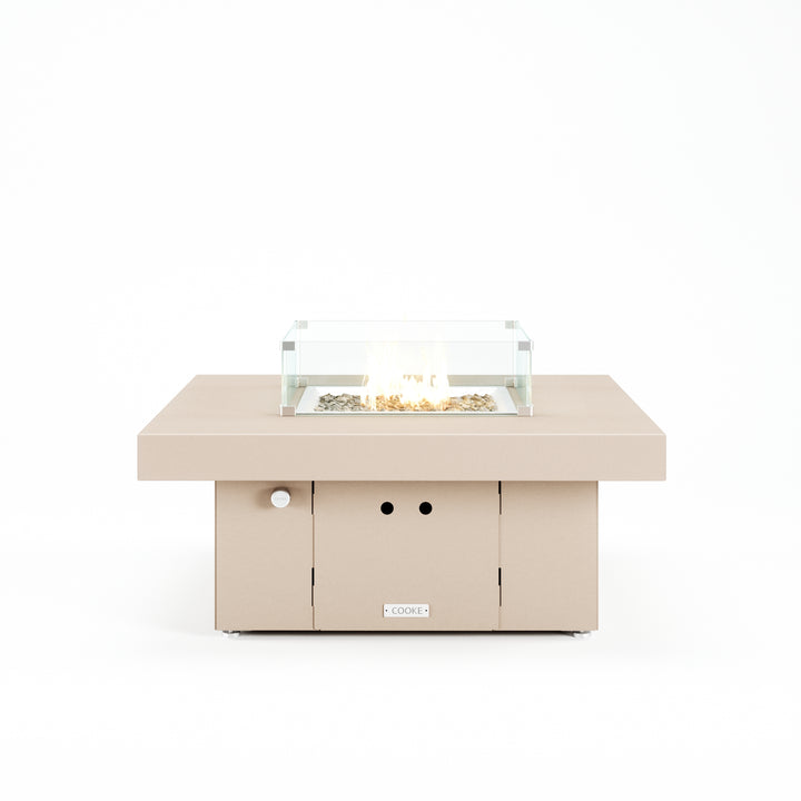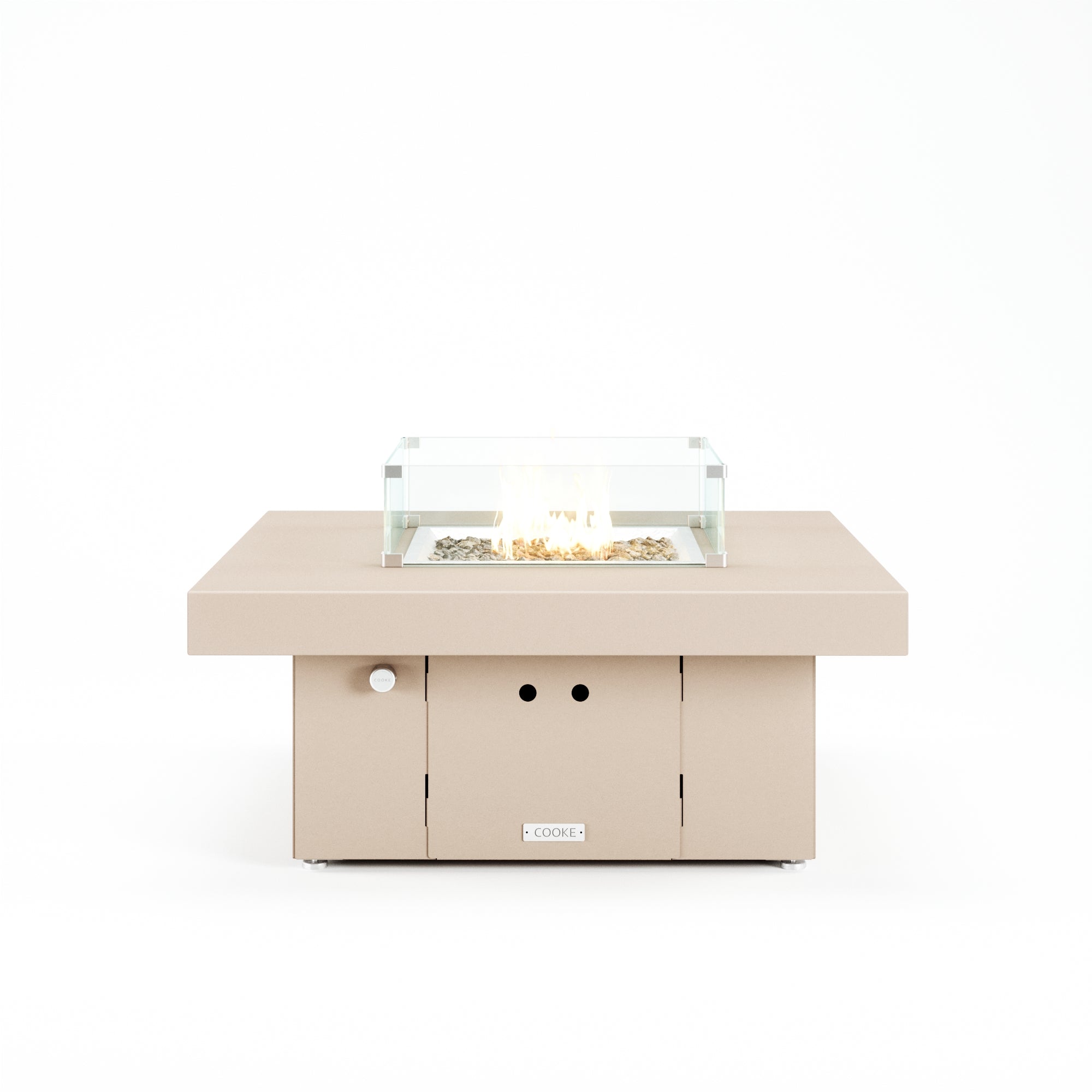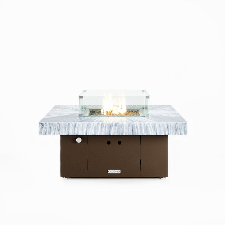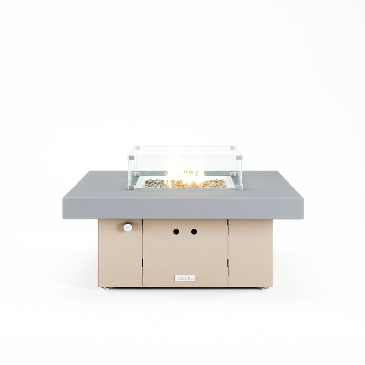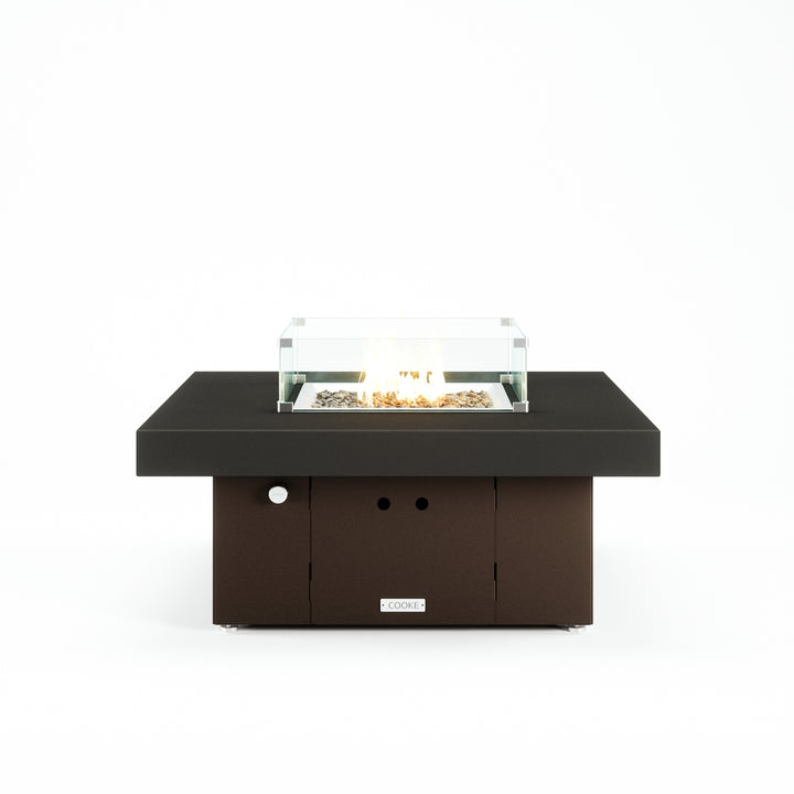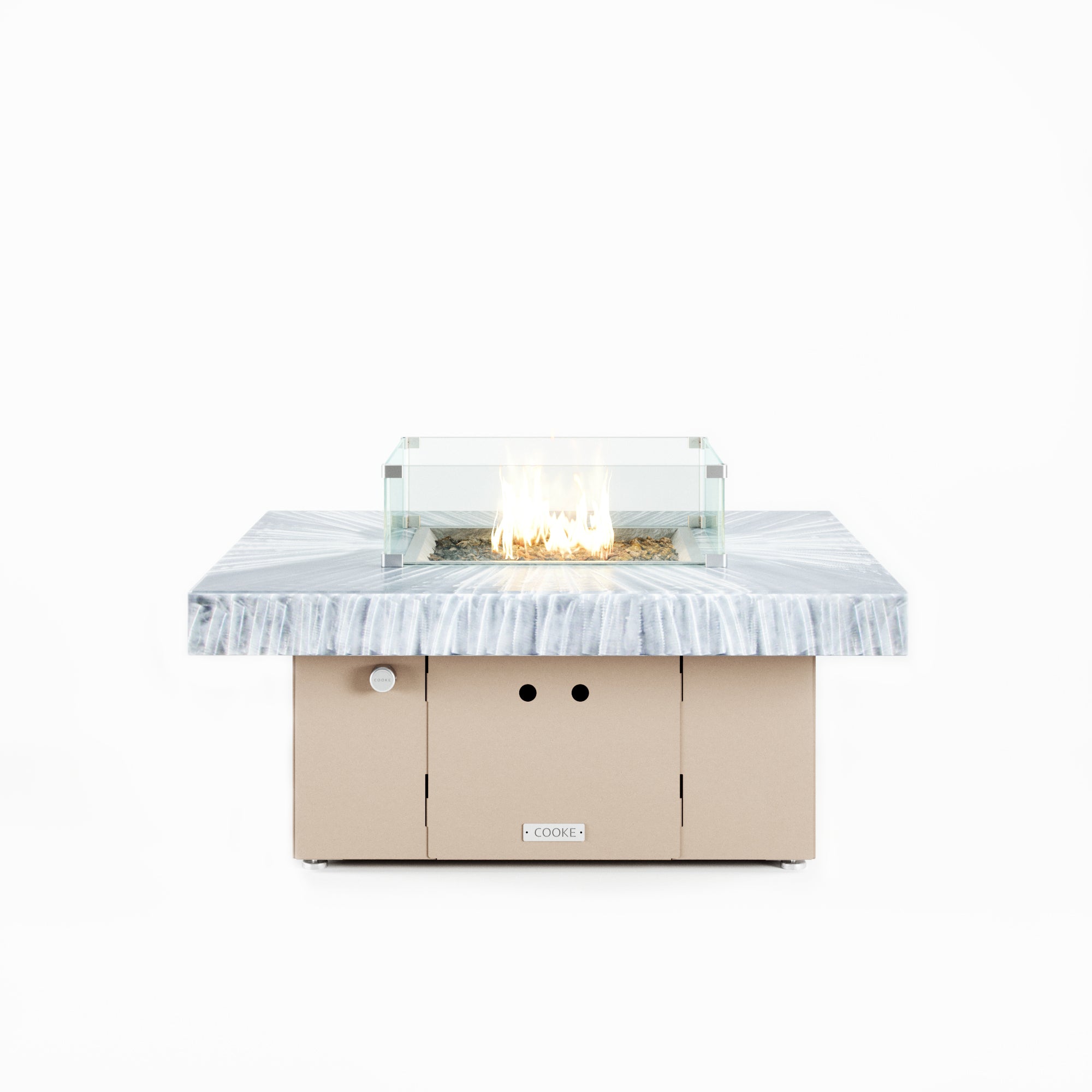 The 40" x 40" is a nice compact square size and accommodates seating up to 4. Our customers love this table's stain resistant aluminum table top which has plenty of room for plates and drinks. COOKE produces some of the finest fire pit tables in the industry which can be seen in the level of detail brought to the table top surface. Finally, a fire pit table with a premium aluminum table top that looks amazing! Cover up the fire pit with the stainless steel burner lid and this table doubles as a premium outdoor lounge table for everyday use.