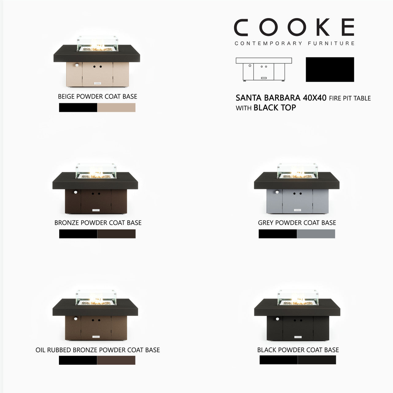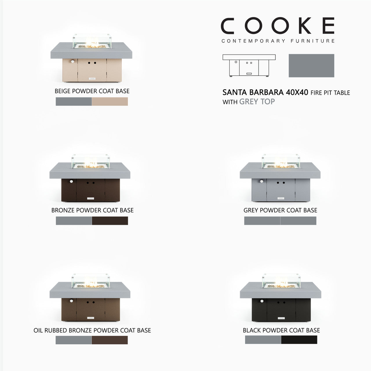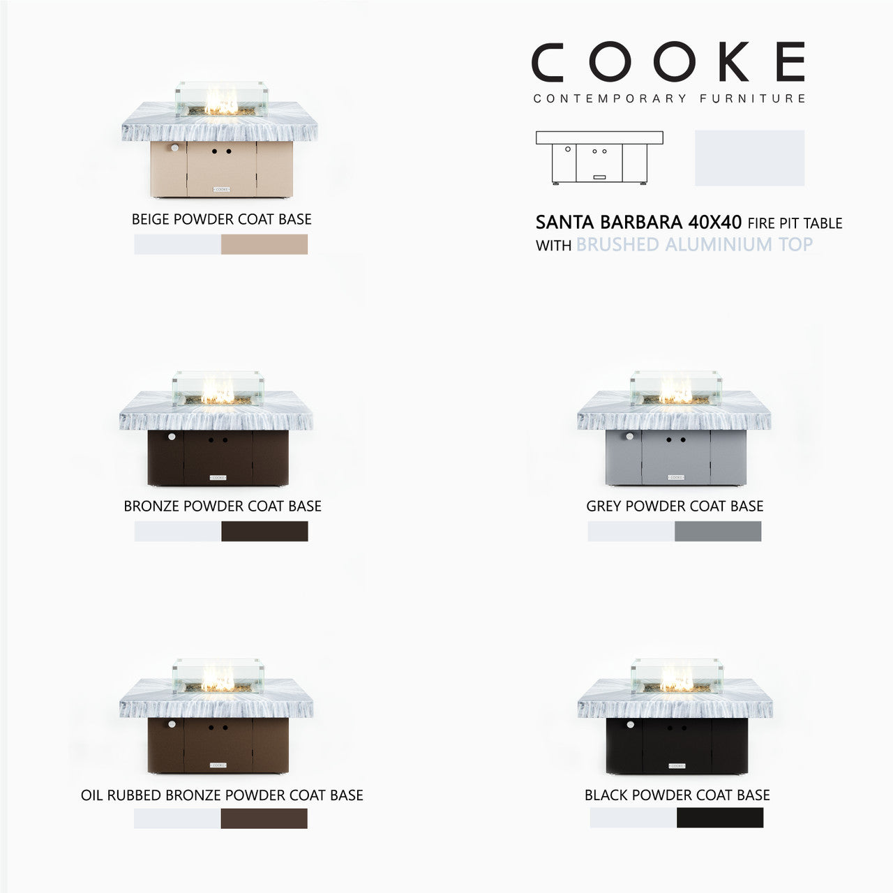 The Santa Barbara outdoor fire pit table is COOKE's contemporary lounge height table with oversized top. This impressive table features a solid, simple, straight sided block base and thick granite or aluminum table top. The Santa Barbara is available in a wide variety of color combinations - a perfect match for your own hardscaped backyard, pool areas, or outdoor living space. Built with the same legendary COOKE quality, this table conveys an impression of permanence, tranquility, and comfort.