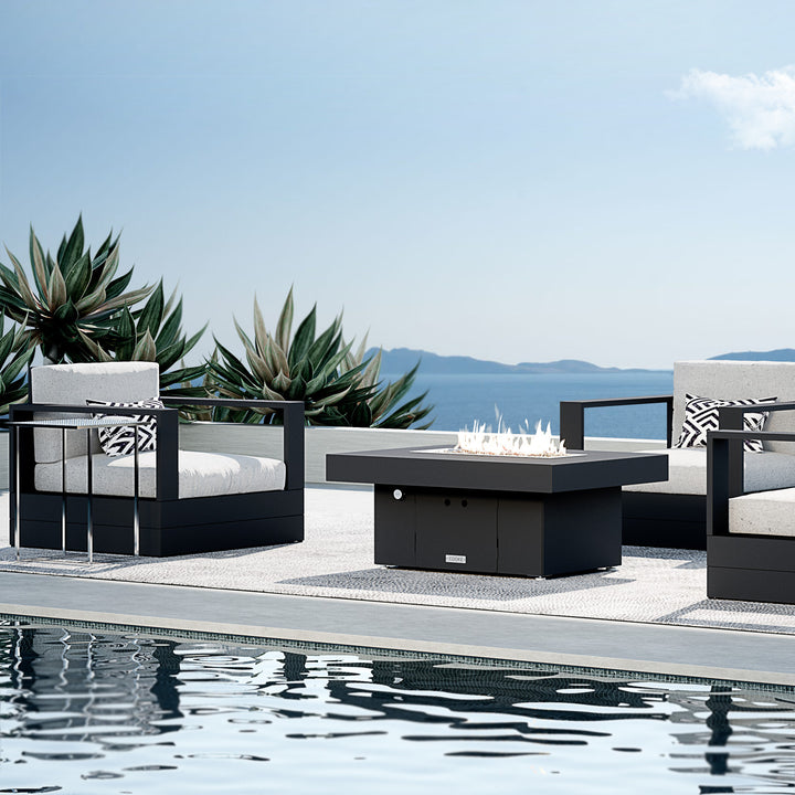 We offer this outdoor fire pit table with a propane or natural gas fuel source configuration. Propane tanks are hidden in the base of the table an easily accessed via a color-matched panel door. There are no unsightly hoses or tanks outside of the table. The natural gas version is hard-lined to your home, commercial, or public space's natural gas source. Perfect for new construction.