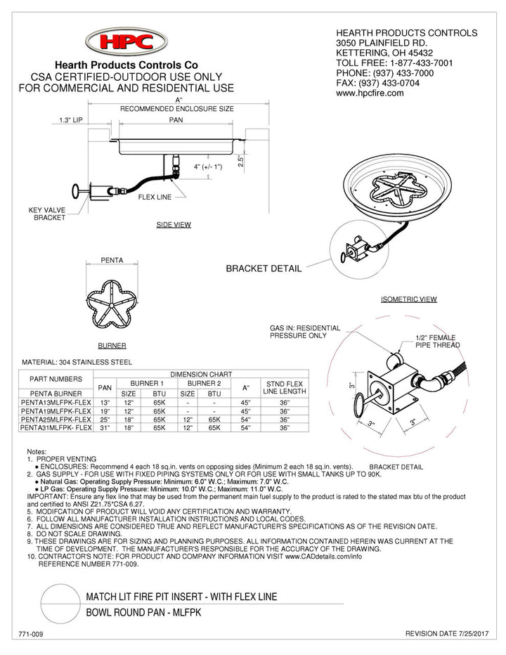 HPC's Match Lit Fire Pit Kit are certified gas fire pit inserts that incorporate a whistle-free flex line between the gas valve and burner pan offering insert flexibility and simpler installation.-Perfect for fire pits without electricity-Flex line configuration-Decorative key valve gas control - Match Lit-UL Certified up to 65k Btu-Comes fully assembled with #304 stainless steel pan, burner, Decorative Key Valve with stainless steel mounting bracket and whistle-free flex line.