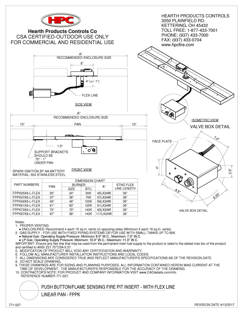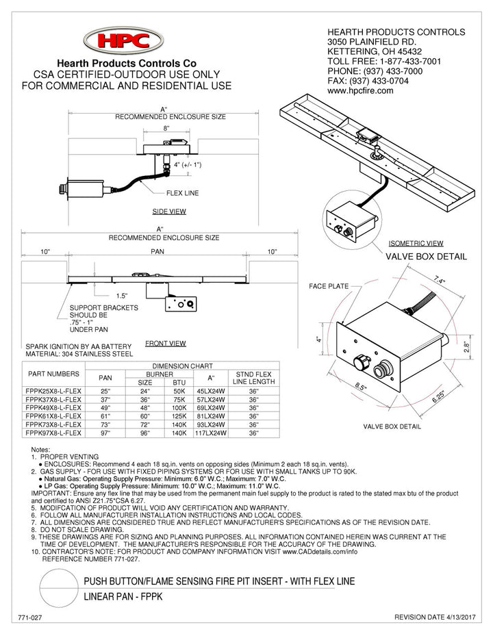 HPC understands not all outdoor areas will have power supplied for the ease and safety of electronic ignition use- but flame sensing in your area may be required by code or you just prefer that peace of mind. The certified Push Button / Flame Sensing line allows both the convenience of push-button ignition with the safety of flame sensing. Lighting the fire is as simple as pushing a button- flame height is fully adjustable via control knob. If the flame blows out the system safely turns off gas.Features:-Fully Assembled and ready to install. Control components are protected within valve box.-Flex Line configuration provides versatile and simple installation.-Start ignition with push button and valve control knob.-Flame sensing- system will turn off gas if flame is lost.-Flame height is adjustable using valve control knob.-Battery Operated System- is perfect solution for installs with no power.-Natural Gas or Liquid Propane: Factory built & tested for either fuel.-UL Certified in US & Canada to ANSI Z21.97-2014 / CSA 2.41-2014 requirements.-Optional Install: Control Box Sleeve for mounting in pavers, metal and more