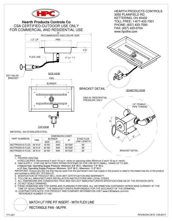 HPC's Match Lit Fire Pit Kit are certified gas fire pit inserts that incorporate a whistle-free flex line between the gas valve and burner pan offering insert flexibility and simpler installation.-Perfect for fire pits without electricity-Flex line configuration-Decorative key valve gas control - Match Lit-UL Certified up to 65k Btu-Comes fully assembled with #304 stainless steel pan, burner, Decorative Key Valve with stainless steel mounting bracket and whistle-free flex line. 30 x 12 inch Rectangle Bowl H-Burner Pan Match Lit Fire Pit Kit By HPC