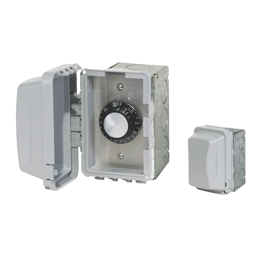 For exposed outdoor situations, single-in-wall heat control systems with weatherproof coverings are available. Use item #14-4110 for applications requiring 120 volts. Use #14-4210 for 240 volt applications only. includes weatherproof front cover, stainless steel face plate, and gang box. Maximum load of 15 amps.