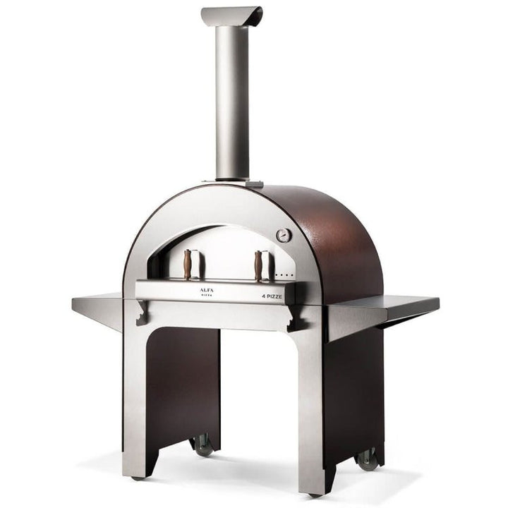 Introducing the Alfa FX4PIZ-LRAM 4 Pizze 31-Inch Wood-Fired Pizza Oven on Base in captivating copper color. Elevate your outdoor cooking experience to gourmet heights with this Italian masterpiece, designed to bring the authentic taste of wood-fired pizza right to your backyard.