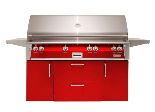 Alfresco 56'' Standard All Grill with Cart in a striking Carmine Red Gloss finish. This premium grill, available in both liquid propane (LP) and natural gas (NG) models (ALXE-56BFGC-LP-S3002/ALXE-56BFGC-NG-S3002), is designed for those who demand both superior performance and bold style in their outdoor kitchen.