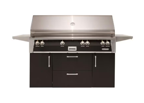 Alfresco 56'' Standard All Grill with Cart in an elegant Jet Black Matte finish. Available in both liquid propane (LP) and natural gas (NG) models (ALXE-56BFGC-LP-SM9005/ALXE-56BFGC-NG-SM9005), this grill is designed for the discerning cook who values both performance and style.