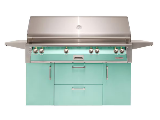 Alfresco 56'' Standard All Grill with Cart in a refreshing Light Green Gloss finish. This premium grill, available in both liquid propane (LP) and natural gas (NG) models (ALXE-56BFGC-LP-S6027/ALXE-56BFGC-NG-S6027), is designed to meet the demands of serious grill enthusiasts who value both performance and aesthetics.