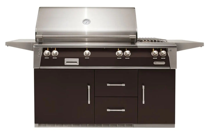 Alfresco 56'' Standard Grill, featuring a refrigerated base and double side burner, all finished in a striking Jet Black Matte. The ALXE-56R-LP-SM9005 (liquid propane) and ALXE-56R-NG-SM9005 (natural gas) models are crafted for the discerning outdoor chef who demands both top-tier functionality and cutting-edge style. This grill offers professional-grade cooking power, convenient refrigeration, and versatile side burners, wrapped in a sleek, matte black finish that exudes modern elegance.