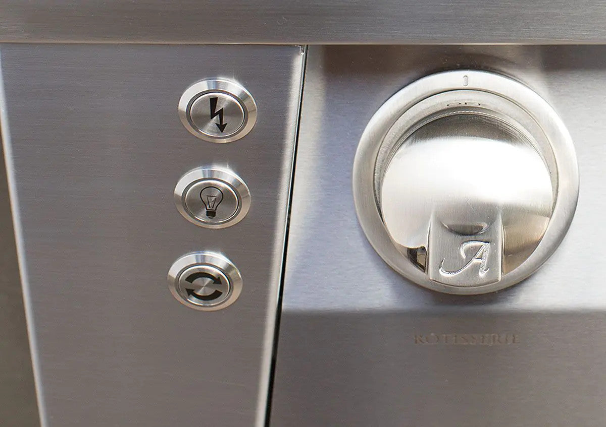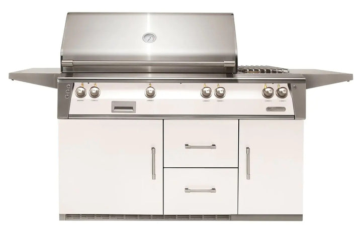 Alfresco 56'' Standard Grill, now enhanced with a refrigerated base and double side burner, all finished in a sleek Signal White Matte. The ALXE-56R-LP-SM9003 (liquid propane) and ALXE-56R-NG-SM9003 (natural gas) models are designed for discerning outdoor chefs who value both performance and aesthetics. This grill combines professional-grade cooking capabilities with the convenience of built-in refrigeration and the versatility of dual side burners, making it the perfect centerpiece for any high-end outdoor kitchen.