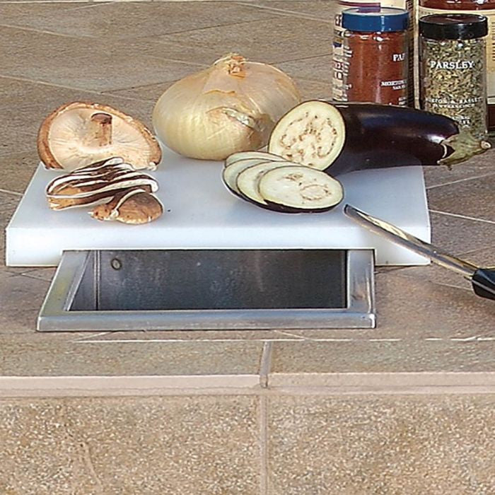 The chute mounts into your countertop directly above a trash can (which is sold separately). This allows for convenient disposal of waste while prepping food outdoors.