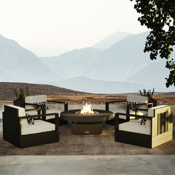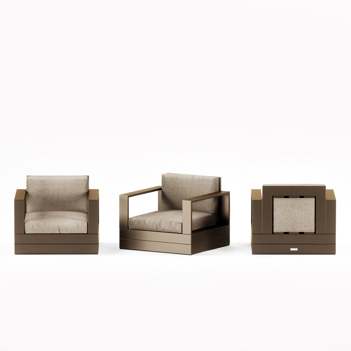 Inspired by modern day needs the frames offer large shelf like platforms under the arm rest to rest your phone, cocktail, or keys. The cushions attach with one large strap providing an accent color when viewed from behind and making removal quick and easy. Frames are available in black, grey, beige, bronze and oil rubbed bronze powder coated aluminum.