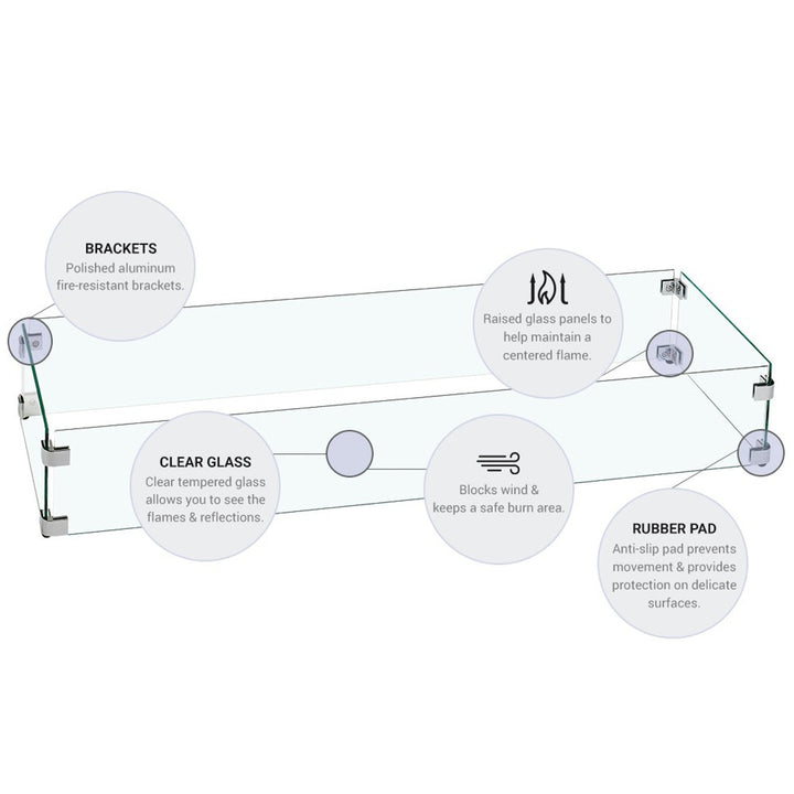 Keep your fire steady and enjoyable with the American Fire Glass 24" Rectangular Glass Wind and Flame Guard. This fire pit accessory is designed to shield your fire from wind, ensuring a consistent flame and minimizing smoke. Made from clear tempered glass, the wind guard offers a clean look while providing optimal viewing of your fire from any angle.