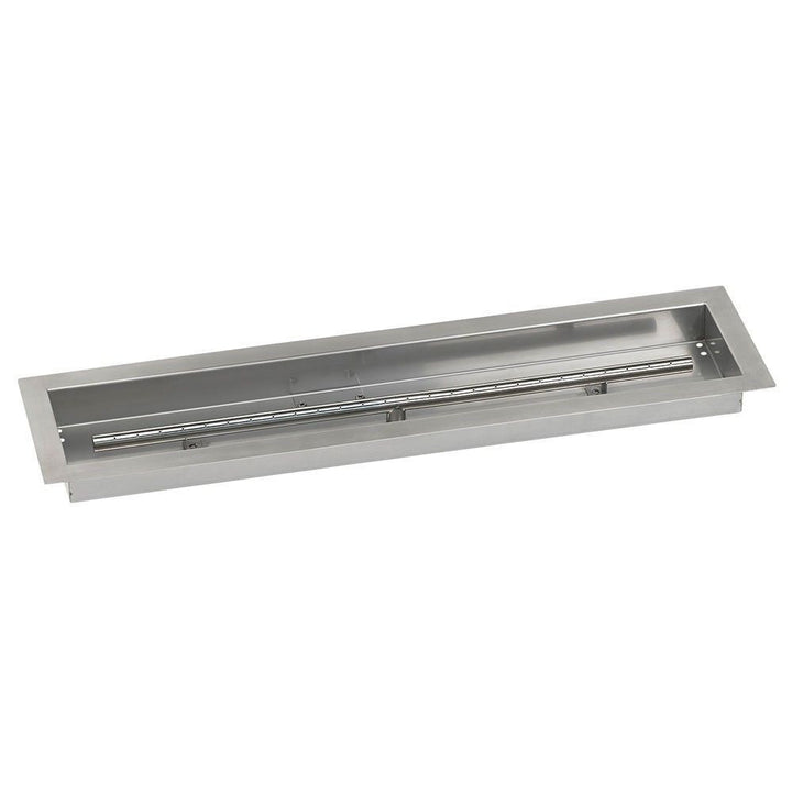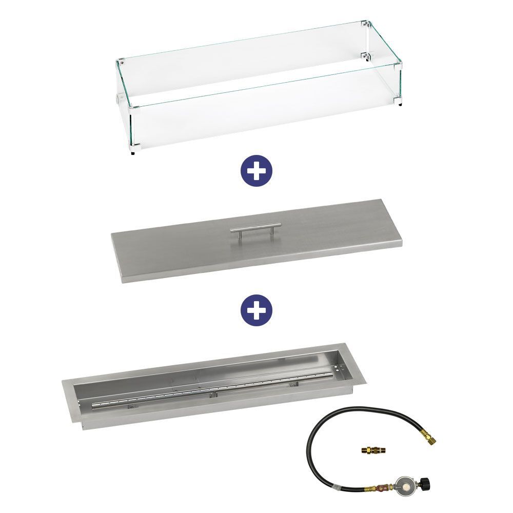 This convenient bundle includes everything you need to create a stunning fire display in your outdoor fire pit. The centerpiece is a 30-inch by 6-inch long, stainless steel linear drop-in burner pan. This pan features a built-in lip that allows for easy placement and removal within your existing fire pit.