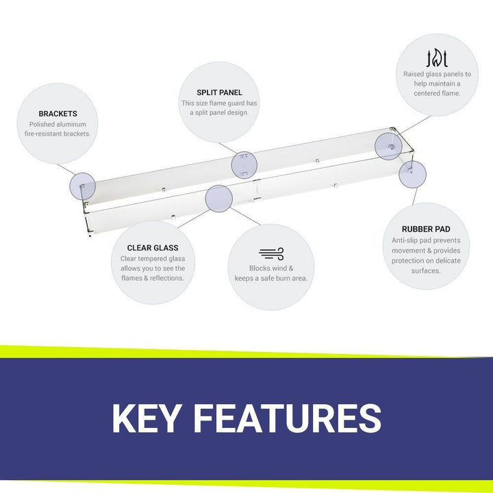 - Durable Construction: Built to withstand the outdoors, the flame guard features fire-resistant tempered glass panels, polished aluminum brackets for secure assembly, and non-slip rubber pads for stability.