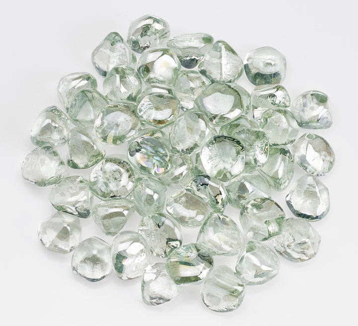 Zircon Luster Collection Fire Glass beads large, smooth glass firepit media that is available in a wide range of beautiful colors. These gems are approximately 1" and have a unique diamond shape that creates the mesmerizing illusion of melting liquid fire. Diamond Fire Gems are able to withstand extremely high temperatures of up to 1300 degrees Fahrenheit and to never crack, or lose their color, shine, or shape! They are also extremely easy maintenance because they don't give off any smoke, soot, or ash. Sold in 10 lb bags.
