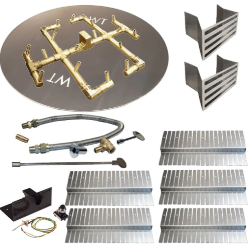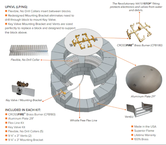 - The kit includes everything you need for a quick and hassle-free setup, even for DIY enthusiasts. The Flex Line/Key Valve Kit simplifies gas connection, while the 9 1/4" x 3" Mounting Bracket and (5) Flexible, No Drill Collars ensure secure and stable support for your paver design.