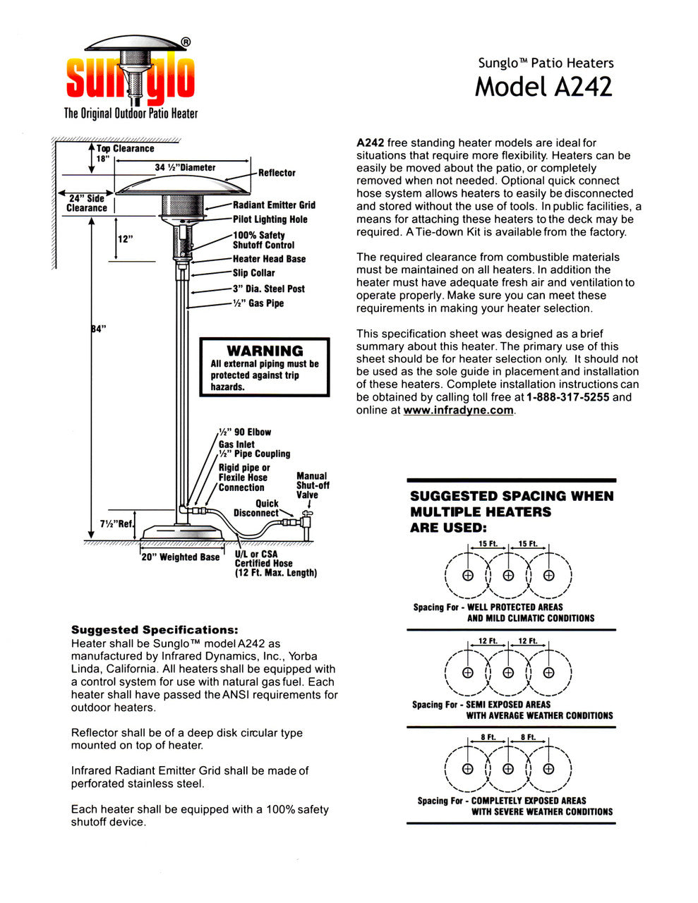 Sunglo Heater A242 is ideal for the patio requiring flexibility. These heaters have a free standing base for portability. Optional hose with quick connect coupling allows the heater to be quickly set up and operated. The Sunglo™ model A242 free-standing heater is ideal for open patio designs. This model offers the flexibility to move or remove the heaters as needed. Optional tie-down kit is available to secure heaters to patio deck as required. When used with optional hose kit make sure that hose pathway does not present a trip hazard. Heat coverage varies depending on the wind exposure on patio. The average spacing between these heaters is 12 feet apart. This heater utilizes a manually operated control system requiring no electrical power. The pilot/safety system provides both convenience and safety. This heater offers a large deep disk aluminum reflector for maximum comfort, a primary aerated burner for minimal noise, and 100% safety shutoff. The post is available in a variety of colors including black, green and bronze powder coat finishes or 304 stainless steel.