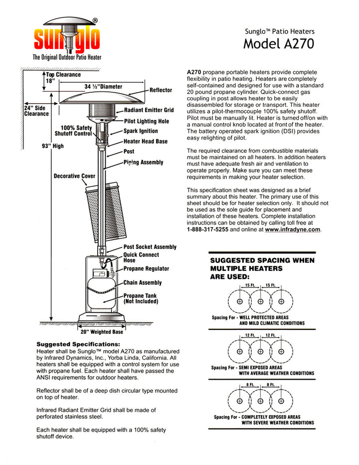 Sunglo Heater A270 portable propane heater is completely self-contained and is ideal for open patio designs. This model offers the flexibility to move or remove heaters for your patio as needed. Heat up the night and keep the party going longer with the best American made portable patio heater! The Sunglo™ model A270 portable propane heater is ideal for open patio designs. The model offers the flexibility to move or remove the heaters as needed. Optional tie-down kit is available to secure heaters to patio deck where required. When used with a standard 20 pound propane cylinder, the heater can be operated continuously for approximately 6 hours. Heat coverage varies depending on the wind exposure on patio. The average spacing between these heaters is 12 feet apart.This heater utilizes a manually operated control system requiring no electrical power. The battery operated DSI pilot ignition system makes lighting the pilot easy and convenient.This heater offers a large aluminum disk reflector for maximum comfort, a primary aerated burner for minimal noise, and 100% safety shutoff. The post and cylinder cover are available in a variety of colors including black, green and bronze powder coat finishes or 304 stainless steel.