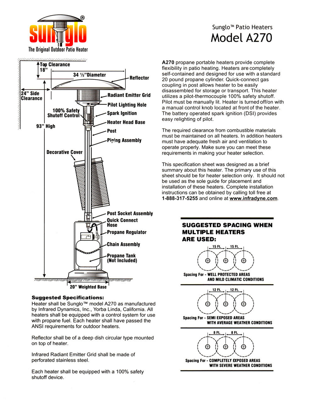 Heat up the night and keep the party going longer with the best American made portable patio heater! The Sunglo™ model A270 portable propane heater is ideal for open patio designs. The model offers the flexibility to move or remove the heaters as needed. Optional tie-down kit is available to secure heaters to patio deck where required. When used with a standard 20 pound propane cylinder, the heater can be operated continuously for approximately 6 hours. Heat coverage varies depending on the wind exposure on patio. The average spacing between these heaters is 12 feet apart. This heater utilizes a manually operated control system requiring no electrical power. The battery operated DSI pilot ignition system makes lighting the pilot easy and convenient. This heater offers a large aluminum disk reflector for maximum comfort, a primary aerated burner for minimal noise, and 100% safety shutoff. The post and cylinder cover are available in a variety of colors including black, green and bronze powder coat finishes or 304 stainless steel.